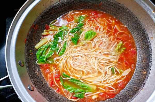 面煮三至五分鐘即可,出鍋前放入青菜煮一分鐘,關火前放入雞精調味。