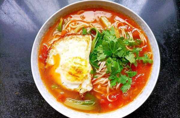把煮好的面放入碗中,放上煎好的荷包蛋放香菜點綴即可。一碗茄香濃鬱的茄汁面就做好瞭,是不是特別的簡單呢,喜歡這碗面的親們約起來吧!