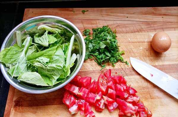 青菜適量洗幹凈備用,香菜切小段,番茄切小塊,大蒜二至三瓣切片備用。(大蒜沒有拍進照片裡)