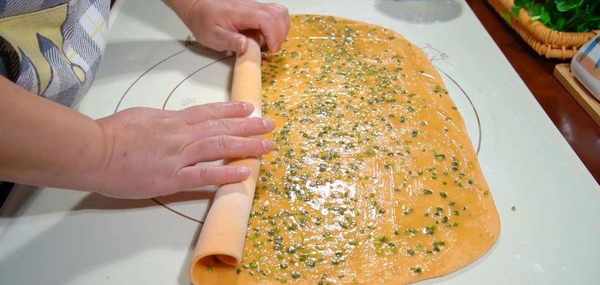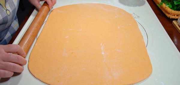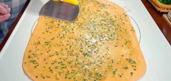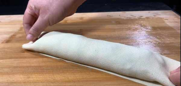 面團也發好瞭,取出來放面墊上,揉一揉排出裡面的氣泡,再搓成長條,按扁搟成長方形的面片,厚度0.3厘米就可以瞭,