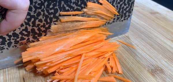 再把胡蘿卜絲也倒入鍋中,焯水一分鐘左右,胡蘿卜焯水可以減輕胡蘿卜本身自帶的青草苦澀味,控水撈出裝入碗中。