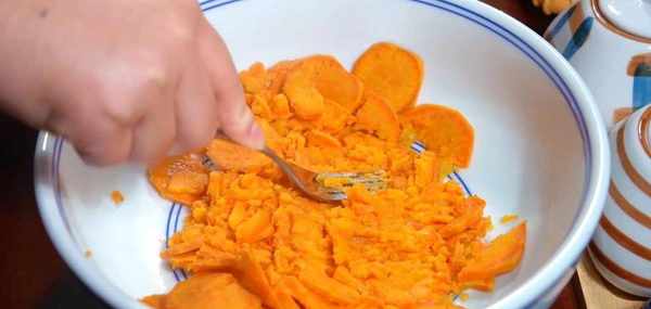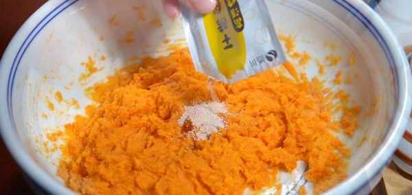 蒸好後的紅薯取出來倒在大盆裡,用叉子壓成紅薯泥,等紅薯泥的溫度降下來之後,再加入酵母粉,