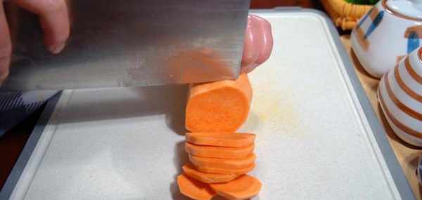 準備一根紅薯,削掉外皮,洗凈後切成片,收入大盤中,涼水放入蒸鍋,開大火燒開後,用中火蒸上20分鐘。
