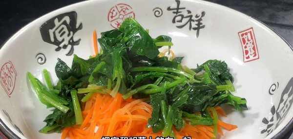 菠菜也透涼瞭,撈出來擰幹水分和胡蘿卜放在一起。
