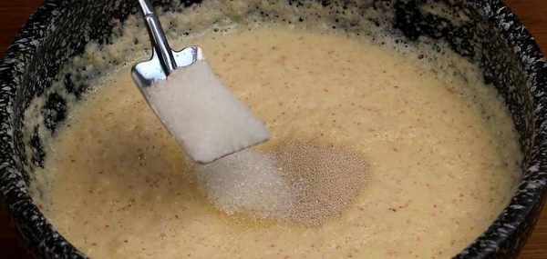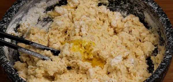 打碎後倒入盆裡,加三顆酵母,十克白糖攪勻,加約300克面粉,再次攪拌均勻,
