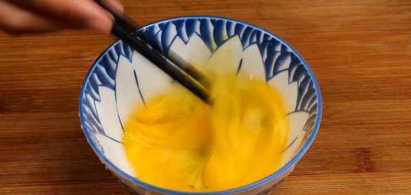 碗中打入兩個雞蛋攪散,