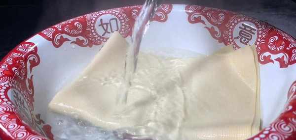 再準備一個大一點的碗,把豆皮放入碗中,倒入開水,把豆皮燙一下,這樣能有效的去除豆腥味,燙好後控水撈出,