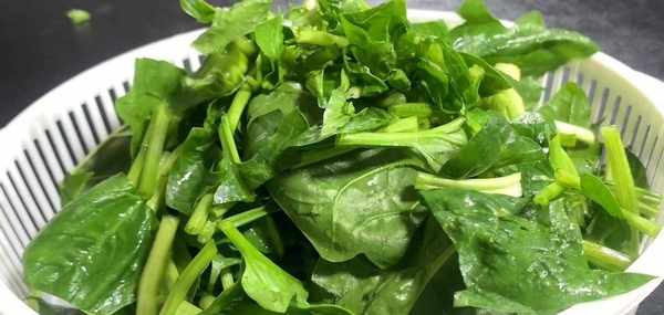 鍋中燒水,把水燒開,加入適量食用油,加入一小勺食鹽,先把切好的菠菜倒入鍋中,加入食用油,把菠菜焯水半分鐘左右,用漏勺控水撈出,倒入提前準備好的涼水裡面。