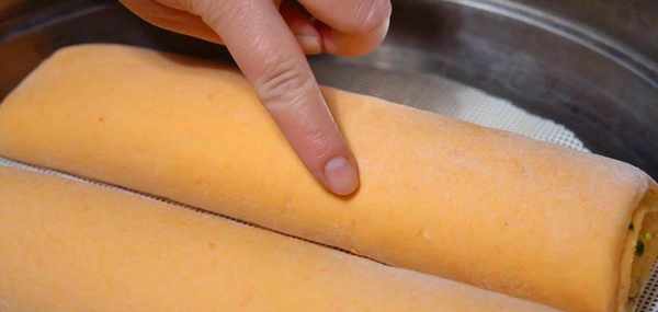 從底部面片卷起來,不要卷得太緊,收口處壓在下面,把生胚從中間切一刀,分成兩段,擺到蒸鍋中,