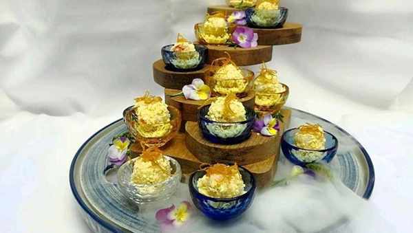 九節蝦12隻、薯片100克、鮮金桔絲50克、食用花、紅線酸膜、金桔油50克、奇妙醬100克