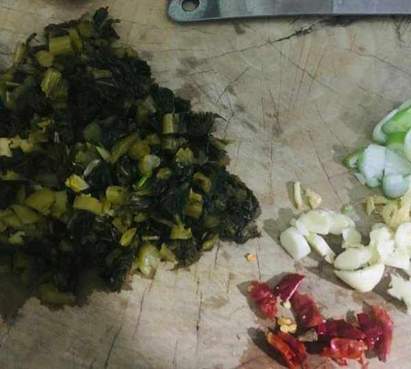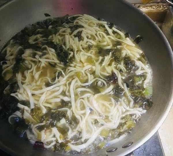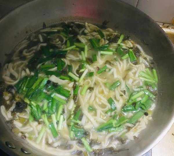 原料:手搟面、酸雪裡蕻、鹽、蔥、幹辣椒、麻椒、玉米面白面1:1、韭菜、雞精、薑、蒜。