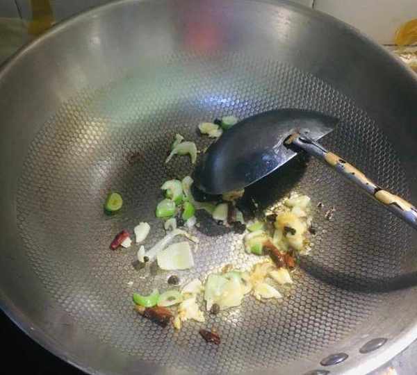 第3步、炒鍋上火放油燒熱,放花椒爆出香味,再放蔥薑蒜幹辣椒炒香。