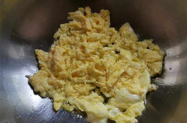 4.鍋內加入油燒熱,淋入雞蛋液,攤開,待蛋液稍凝固,再把雞蛋翻炒成塊,將雞蛋塊盛出待用。