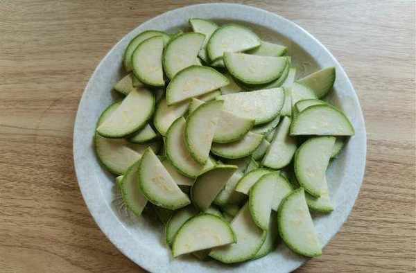 3.西葫蘆對半切開,再頂刀切成片。不要太薄,太薄燒制時容易碎,比硬幣稍厚一些就可以。