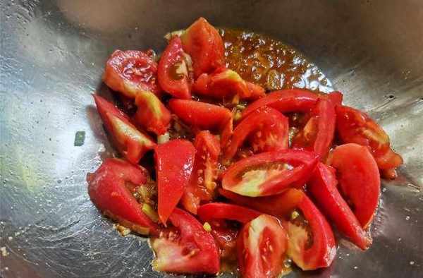 6.鍋內再添加少許油,下入蔥花和蒜片爆香,再下入西紅柿翻炒,將西紅柿翻炒出汁。