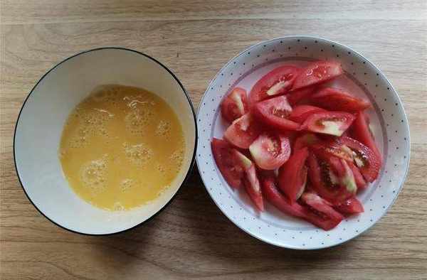 2.雞蛋磕入碗內,攪打均勻,使蛋清和蛋黃充分融合在一起,西紅柿去蒂,再把西紅柿切成塊。