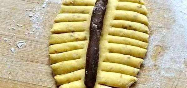第三步、把醒發好的南瓜團拿出來,然後再用手把裡面的空氣搓出來,之後分成劑子,劑子和豆沙餡一樣多就行,再把所有的南瓜面劑子揉成圓形在按扁,再用搟面杖搟成橢圓形,把豆沙餡放在裡面後,再用刀把南瓜團的邊緣切幾刀,要切的對稱要不然不好看,之後再把它編起來。