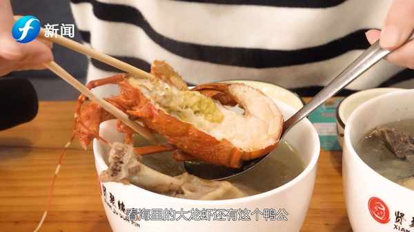 主持人:來這傢吃燉罐後你就會發現以前吃的所有燉罐那都不叫燉罐,首先份量上,是以前吃的兩倍,另外大傢看看裡面的材料,真的是非常紮實。看,海裡的大龍蝦還有這個鴨公,鴨公的腿是非常好吃的,還有這個大鮑魚,要到海鮮市場挑一挑才能有。這個大龍蝦已經被我掏空瞭,真的是太美味瞭,保持瞭海鮮原有的鮮味沒有添加任何的添加劑,今天註定是要迷失在各種大蝦、大鴨腿、大螃蟹、大鮑魚之中瞭。