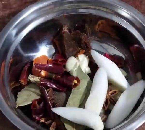 4.煮好後將雞肉撈出放入碗中備用。準備一個空碗,碗中加入適量名揚的火鍋底料,若幹大蒜、少許花椒、幾片桂皮、若幹八角、幾片香葉、幾個白芷棍、幹辣椒少許、再加上蔥白切段,薑片若幹備用。