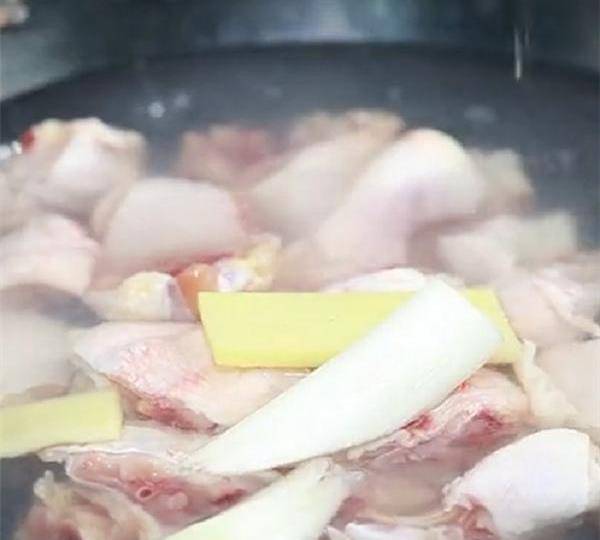 3.起鍋燒水,將雞肉冷水下鍋,放入適量料酒、若幹蔥段以及薑片,讓雞肉焯一下水,煮掉血水去掉腥味,水開後撇去浮沫。