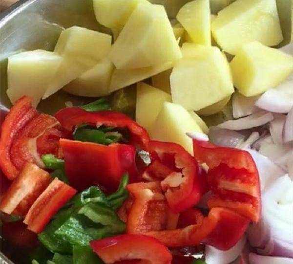 2.接下來準備配菜,準備兩個土豆去皮洗凈後切成滾刀、胡蘿卜切成滾刀,洋蔥切片、辣椒、青紅椒切塊,生薑切片、大蔥切段,大蒜拍碎。