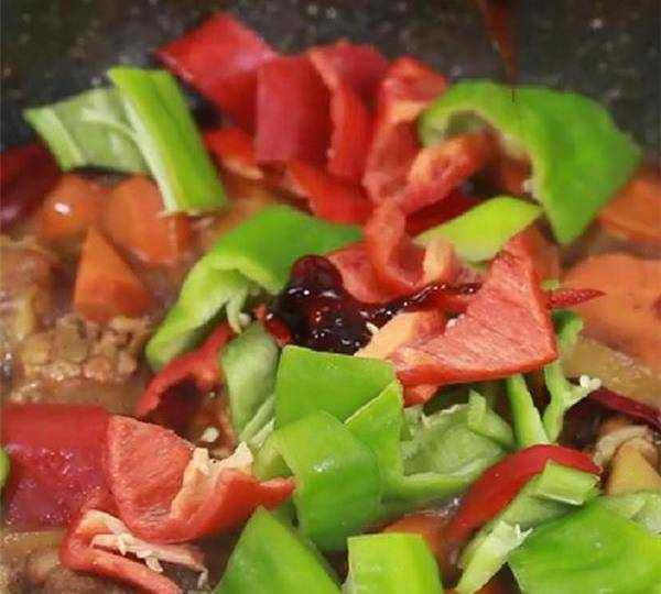 5.起鍋燒油,下適量的白糖,開小火炒糖,使其炒至焦黃色,倒入雞塊,翻炒均勻使其雞肉裹上焦糖色後盛出備用。洗鍋後重新起鍋燒油,倒入剛剛準備的料頭炒香,炒香後下入雞肉,再下入少許料酒,豆瓣醬、少許醬油、老抽、蠔油,再加入一大勺清水,沒過雞塊,下入十三香、雞精、鹽、白糖、啤酒少許,(也可以不放)翻炒均勻後,蓋上鍋蓋。