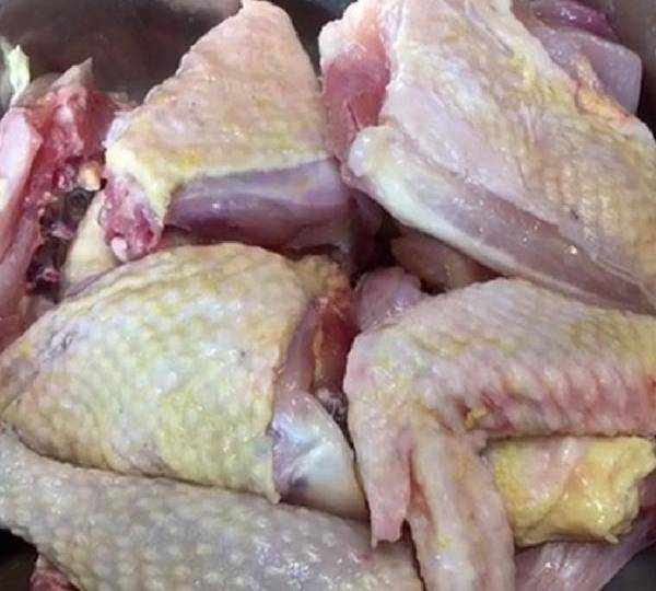 首先準備一隻殺好的三黃雞,清洗幹凈後,放上案板,用刀先將雞脖子處下刀,去掉雞嘴巴,然後一開為二,放在碗中備用,二次清洗。接著將雞脖子裡的喉管去掉後,將雞脖子剁成幾塊,然後去掉雞尾巴,將三黃雞從中間劈開,去掉雞肺,去掉內臟瘀血。其他的肉依次斬切成塊放入盆中備用。