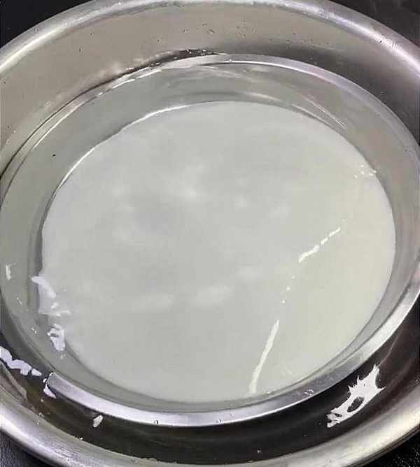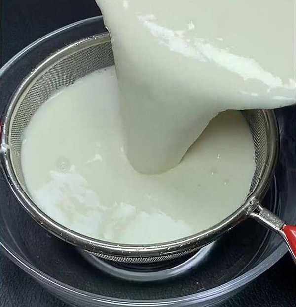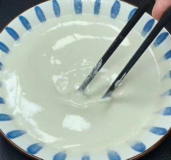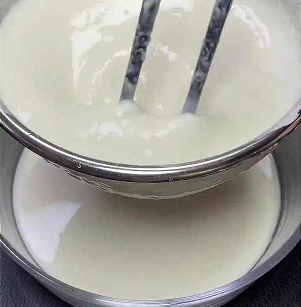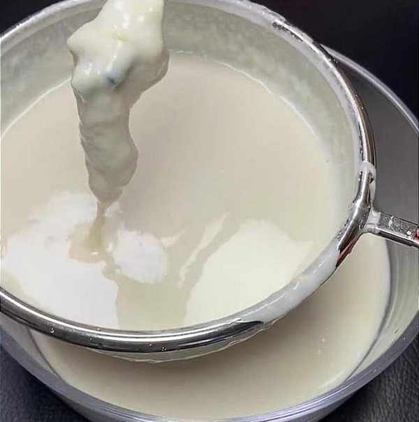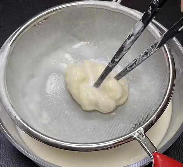 做面皮的第二個關鍵點,過濾。用過濾網給它過濾兩遍,這樣做出來的涼皮口感會更加的細膩,不容易破。