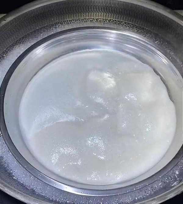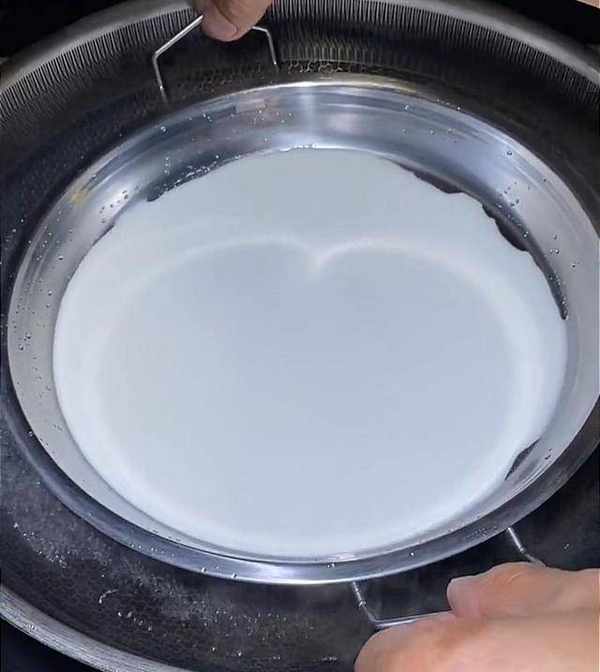 水開放入鍋中,用中火蒸煮一分鐘,蒸至表面起泡就可以瞭。取出模具放到涼水中給它拔涼。