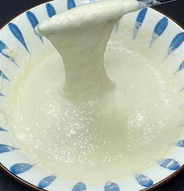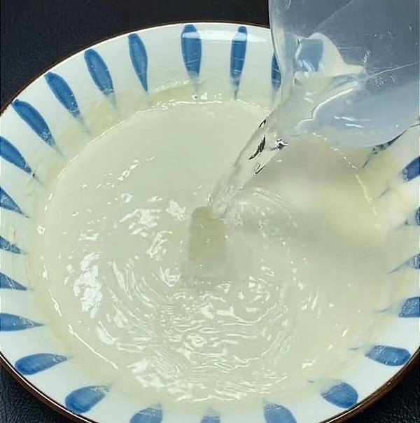 20分鐘過後,往醒好的面裡一次加入200克溫水給它卸開。