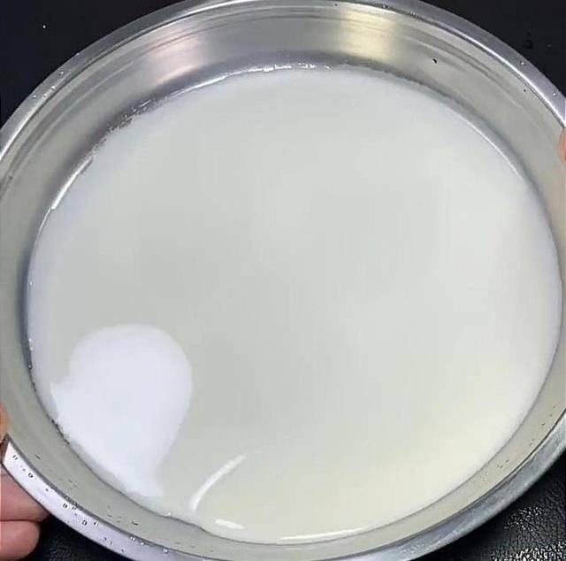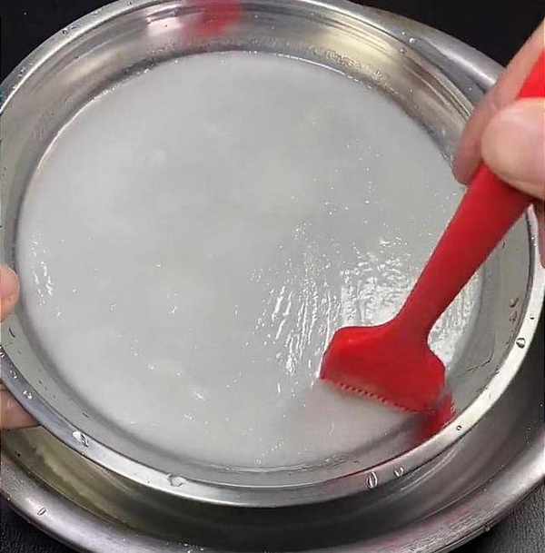 接著,找一個無油無水的涼皮模具,裡面倒入一勺面糊(面糊的多少要根據模具的大小來定),然後給它搖晃均勻。