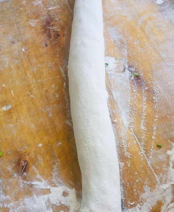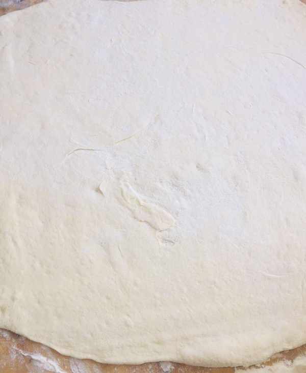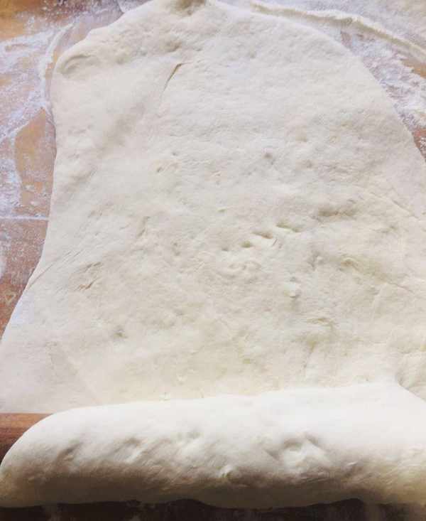 5.面醒好以後,取一塊面,用搟面杖將其搟成薄餅形狀。