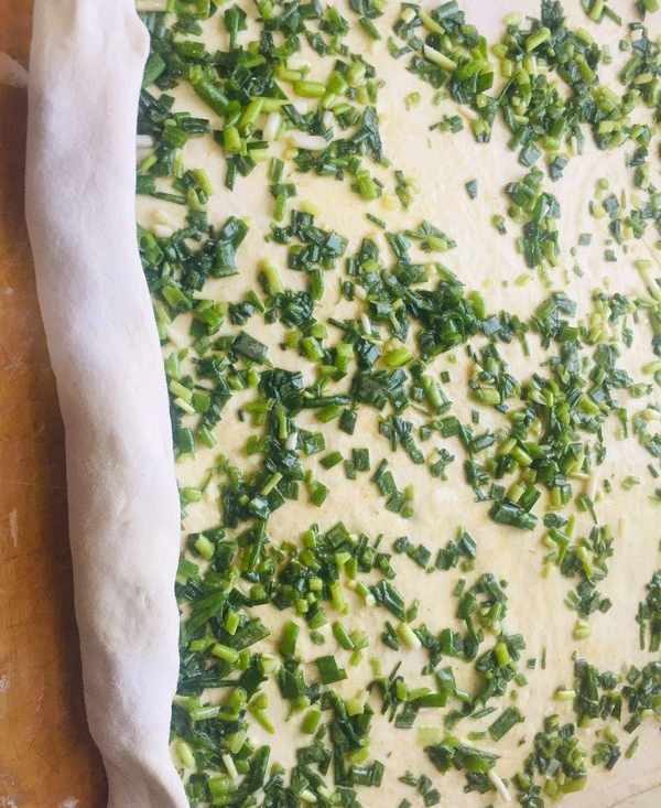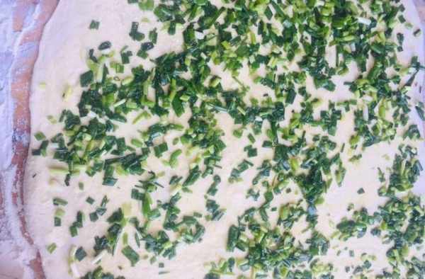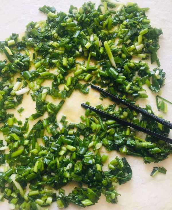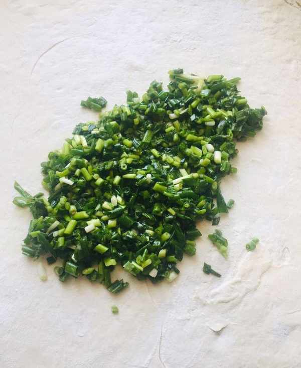 6.將拌好的小蔥放在面餅上,然後把它鋪抹均勻。