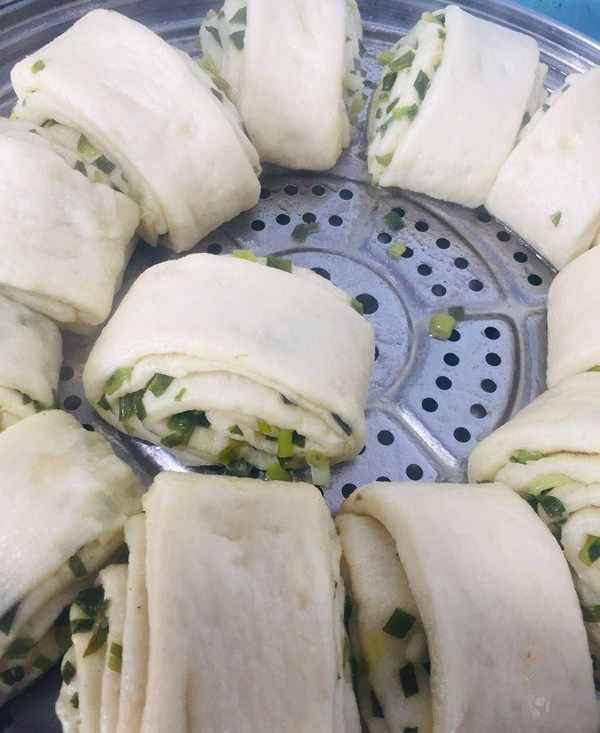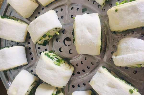 8.將做好的蔥卷面劑放在蒸鍋中,大火蒸二十分鐘就可以瞭,蔥花卷也就制作完成瞭。