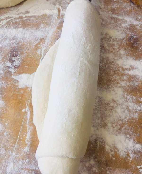 7.這時我們把面餅從一頭開始卷起來,卷成一個條狀,然後用刀切成長方卷。