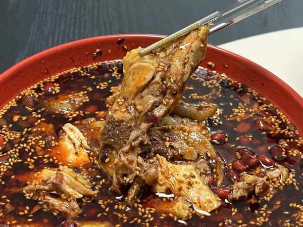 棒棒雞按老板的介紹是不用加熱,雞肉+雞高湯+紅油辣子混合拌勻,最後撒上炸花生米就可以吃瞭。(但我試瞭直接拌和雞肉過沸水加熱下,兩者其實口感沒差)