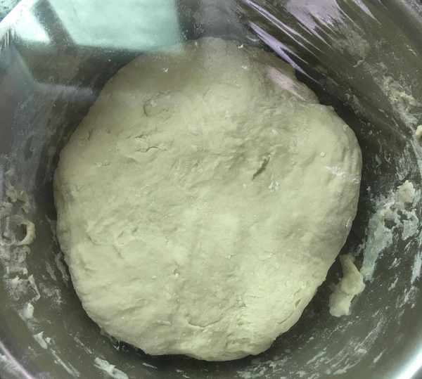 第一步:面粉裡加入酵母,用筷子一邊攪一邊加水,加完水後,用手和成面團,包上保鮮膜醒發2個小時左右。我一般是頭天晚上和好面,放進冰箱冷藏,第二天早上拿出來用。如果是天冷的時候就不用放冰箱瞭。