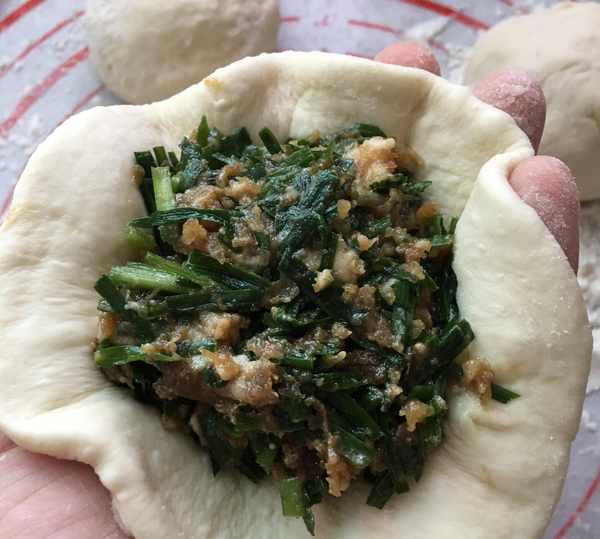 把面劑子按成邊上薄,中間稍厚的面皮,包入韭菜肉餡,盡量多放,隻要留夠邊收緊就可以。(面皮中間厚,邊上薄就是為瞭包入餡後,容易收口且不會破皮露餡)