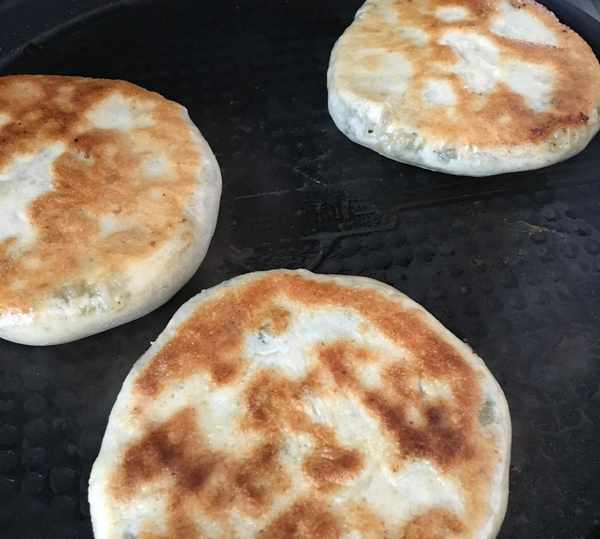 第三步,電餅鐺預熱刷油,或者平底鍋加熱倒入少量油,把餅坯放入,煎到兩面金黃就可以瞭。