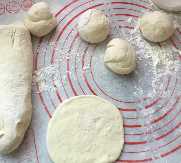 第二步,手上粘上面粉,把面團拿出來排氣,揉面排氣後分成等量的面劑子。