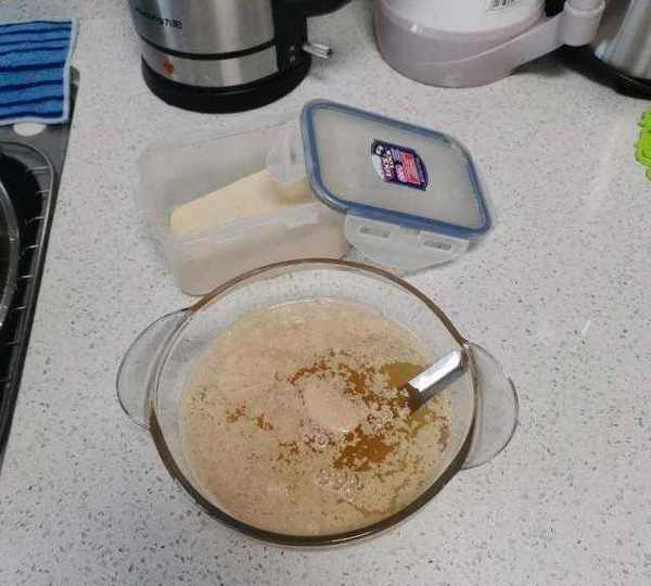 第1步、啤酒放微波爐叮半分鐘微熱拿出,晾至35℃加發酵粉少許。