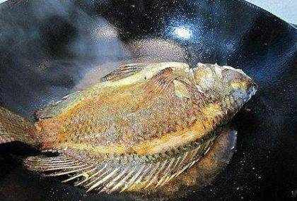往鍋中倒入適量的食用油燒熱,一定要記住油溫的控制非常重要,等到鍋中油溫達到5成熱的時候,就可以將鯽魚的表面水分擦拭幹凈,接著拿起魚尾,用鍋鏟將熱油淋在魚身上面,這也就是所謂的吊魚手法,等到魚身表面微熟後,再將頭部慢慢的放到鍋中,這個時候一定要轉成小火慢煎。