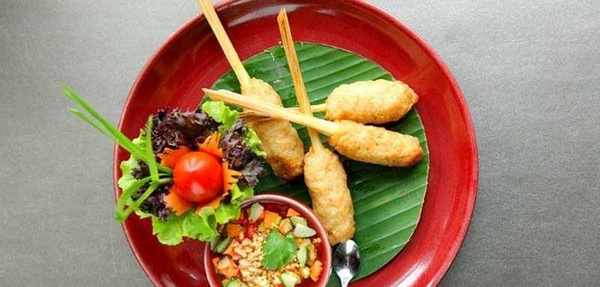 搭配由黃瓜、胡蘿卜、花生碎、香菜、糖、魚露、檸檬汁調配的醬汁即可