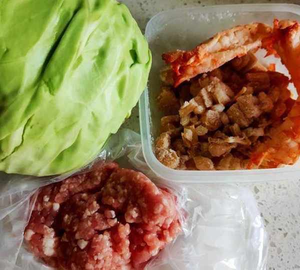 第2步、圓白菜一個,豬肉餡,我用瞭熟蝦熟鮮貝,解凍即可。