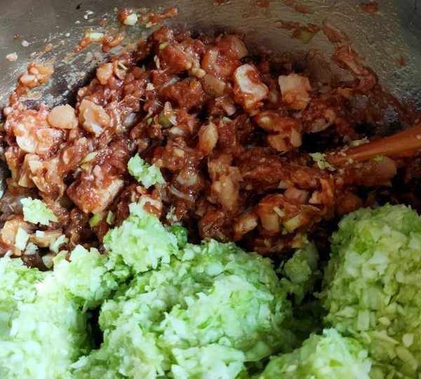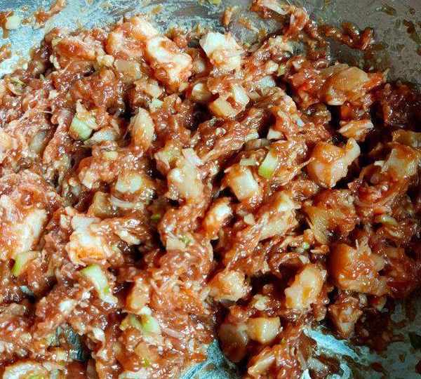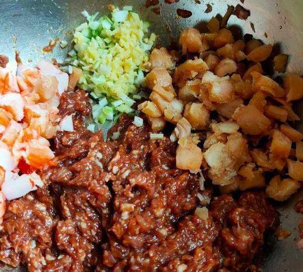 第9步、豬肉餡裡面先加入一點點水調開,再加入生抽,蠔油,雞精,香油,花生油,鹽,朝一個方向攪拌均勻,再把蔥薑末,蝦仁鮮貝放進去。