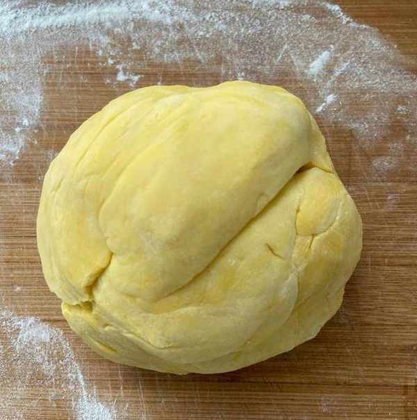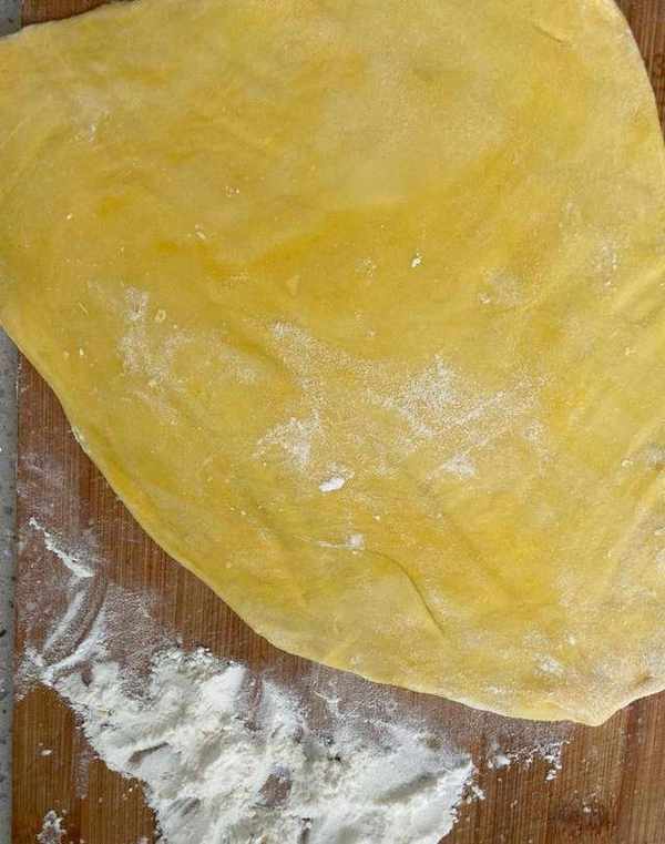 5.準備好搟面皮瞭,將面團搟成餅狀,輕薄,根據自己喜好自定義厚薄程度。〖要是地方不夠可以分批次搟面,案板上撒面粉,面團也撒點面粉,搟面杖抹勻面粉防粘黏〗