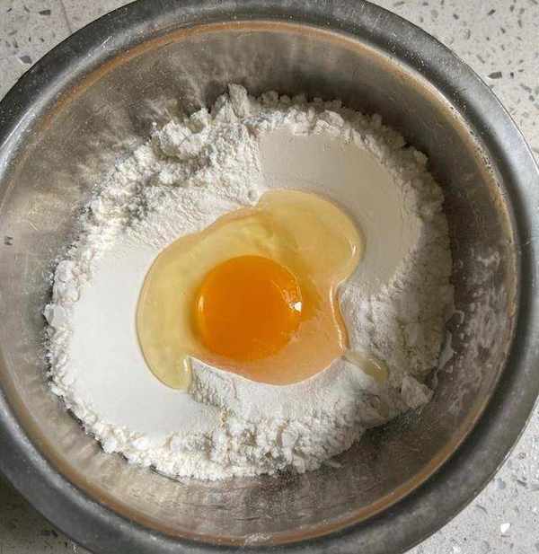 1.首先在容器中倒入適量面粉,在面粉中灑入少許食鹽攪拌均勻,再打入一個雞蛋