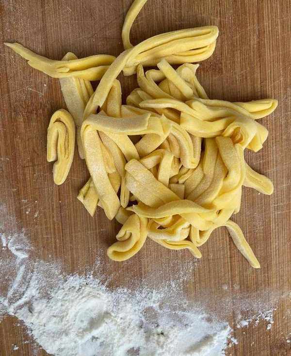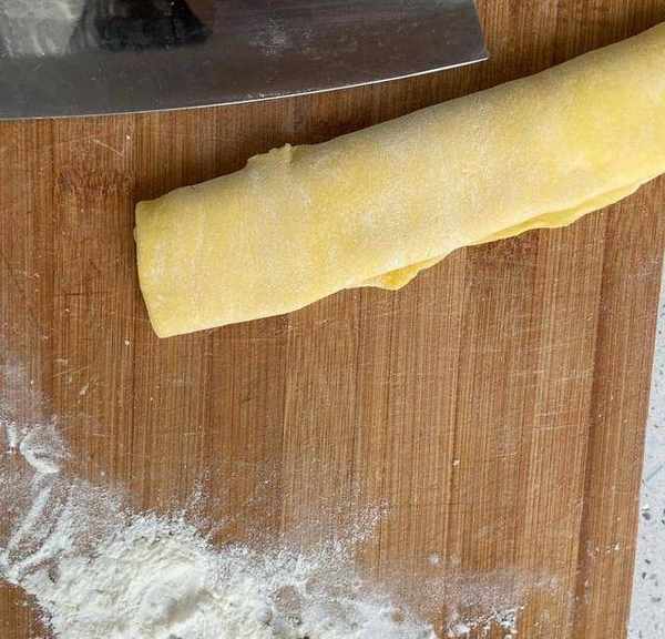 6.搟好後將面皮兩面抹勻面粉,卷起來或者攤平,切成條狀即可