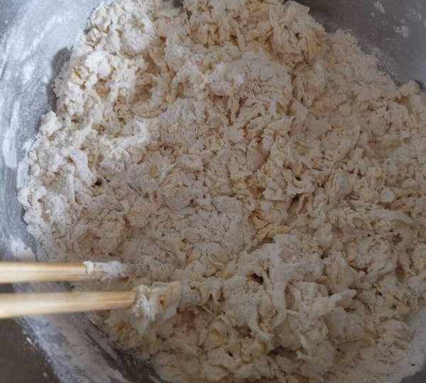 第2步、分次加入60克清水,邊加邊攪拌,成大面絮狀。。
