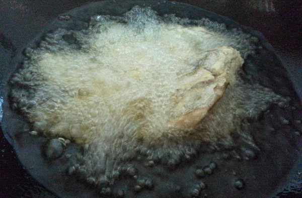 去頭尾剪掉魚鰭掏去內臟洗去黑膜,切成斜段,洗洗晾下裹上地瓜粉【淀粉無特別要求你可以用炸粉生粉等】